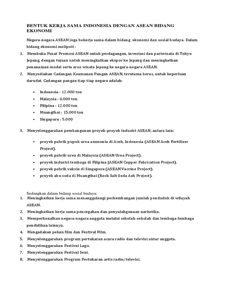 Organisasi yang terbentuk pada 8 agustus 1967 ini telah memiliki jumlah anggota sebanyak sepuluh negara, termasuk salah satunya adalah negara indonesia tercinta kita ini. Pasalnya, bidang masalah ini terbilang komplikatif. Gambaran bidang ekonomi dan bisnis di indonesia. Akibat jumlah penduduk terus bertambah dengan pesat dan kebutuhan manusia juga meningkat, untuk memudahkan usahanya manusia mulai mengadakan pembagian kerja. Kerjasama di bidang ekonomi antarnegara di dunia baik dalam ranah regional maupun internasional.