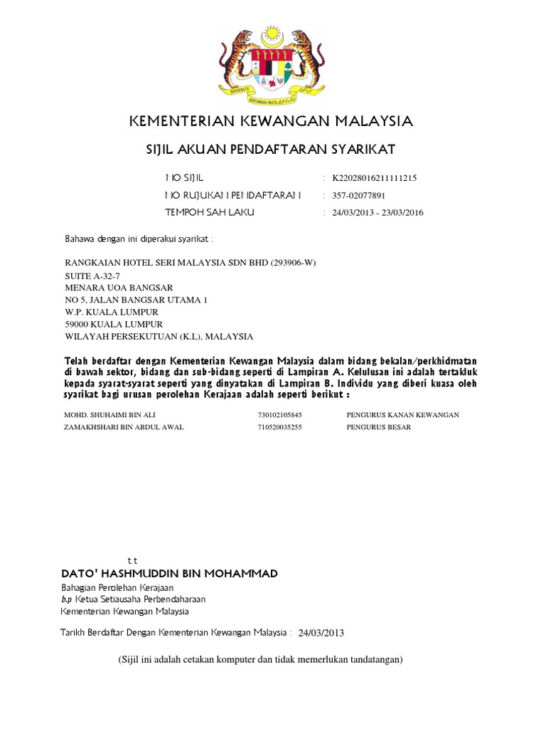 Kementerian kewangan malaysia sijil akuan pendaftaran syarikat no sijil 1.5 kementerian kewangan malaysia berhak untuk membuat lawatan atau pemeriksaan audit pada 1.7 kegagalan syarikat membuat permohonan pembaharuan pendaftaran selepas satu (1) tahun dari.
