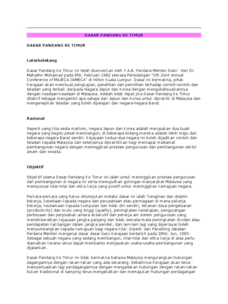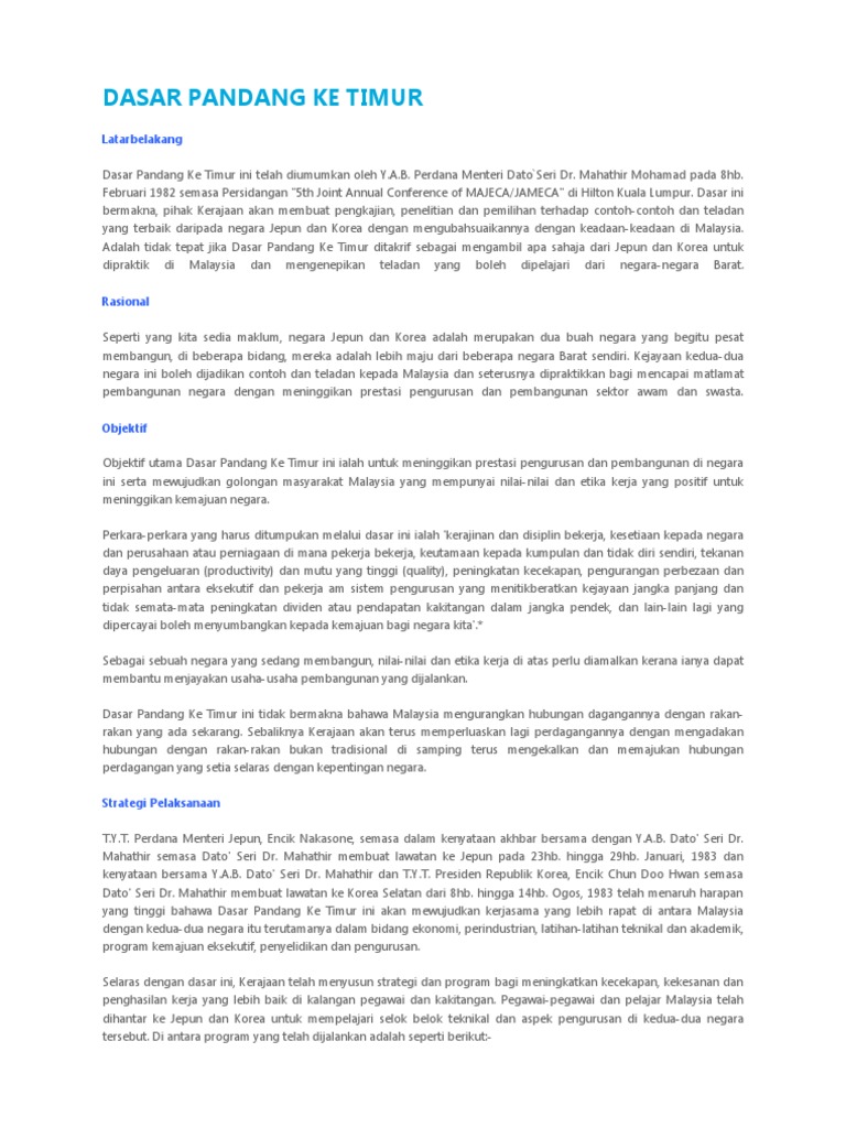 Dasar pandang ke timur ini telah diumumkan oleh y.a.b. Walaupun dalam dasar pandang ke timur melihat kepada negara seperti jepun, korea selatan, taiwan dan singapura, tetapi tumpuan lebih kepada jepun. Dasar pandang ke timur juga merupakan salah satu dasar kerajaan yang telah diumumkan oleh y.a.b perdana menteri dato' seri mahathir mohamad ketika persidangan 5th joint annual conference of majeca/jameca di hilton kuala lumpur pada 8 februari 1982. Dengan alat kami yang gratis dan mudah digunakan, anda dapat menghapus halaman pdf dengan gratis dan mendapatkan file baru berisi halaman yang anda butuhkan saja. Februari 1982 semasa persidangan 5th joint annual conference of majeca/jameca di hilton kuala lumpur.