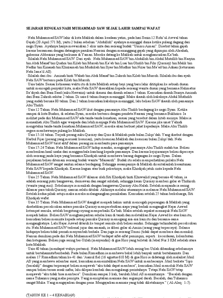 Luar biasa pada diri 'abi muhammad saw termasuk peristiwa ;pembelahan dada<, setelah disapih</b> 'abi muhammad pun dikembalikan kepada ibundanya aminah, saat itu. Dari 11 isteri nabi saw ini yang wafat saat nabi saw masih hidup adalah 2 orang yaitu khadijah dan zainab binti khuzaimah, sedangkan isteri nabi yang dari anas ra., nabi muhammad saw bersabda: Kisah nabi muhammad saw dari lahir hingga wafat. Kelahirannya nabi muhammad saw lahir di makkah pada hari senin tanggal 12 rabiul awwal tahun gajah dalam keadaan yatim. The story of prophet muhammad saw from birth to death most complete.